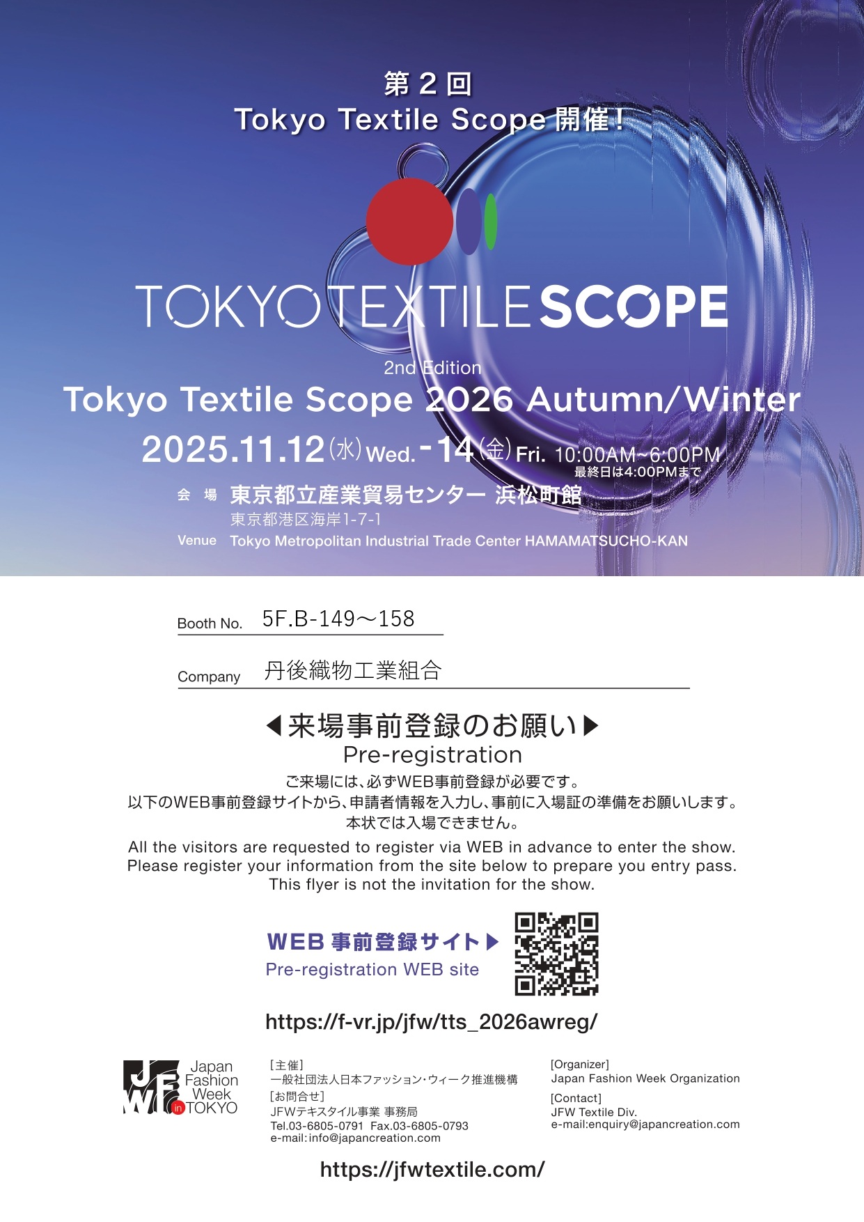 この度、丹後織物工業組合主催にて「丹後織物総合展」として、来る11月12日(水)~11月14日(金)に開催される「Tokyo Textile Scope 2026 Autumn/Winter」に織物事業者トップランナー9社が出展いたしますので、ご案内いたします。