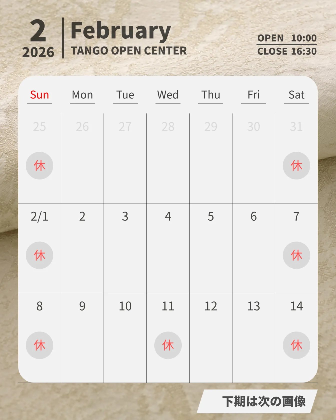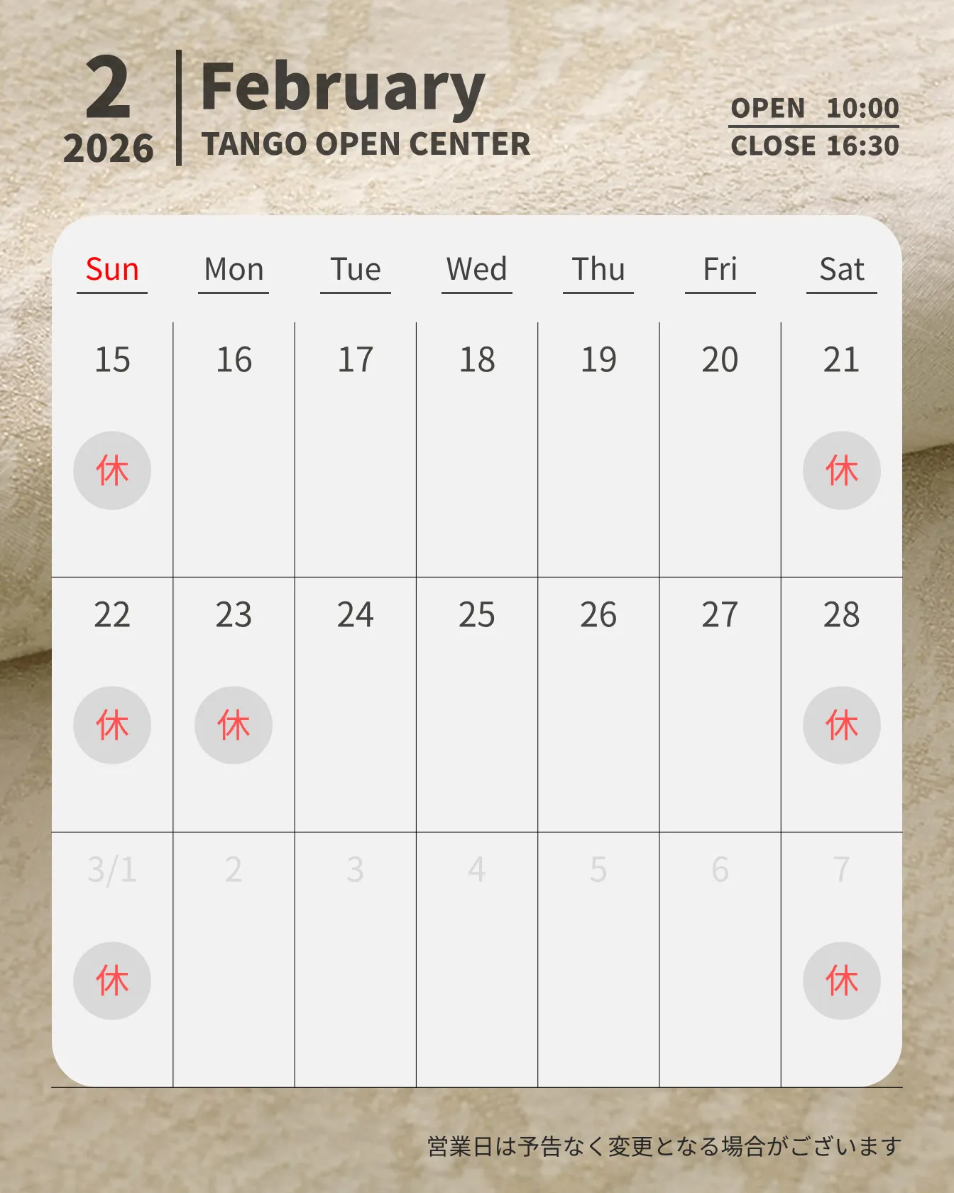 【2026年2月 ショップ営業カレンダー】